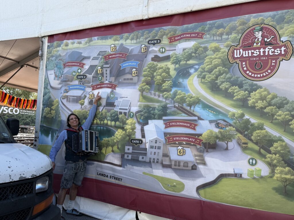 One day down, six more to go! Alex is pointing to where you’ll find the band at Wurstfest each day through Thursday!