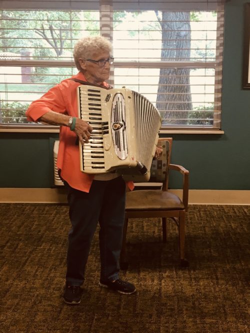 Alice Grandon has been playing the accordion for 77 years, since the age of 7. She has played in bands and orchestras and at parades and nursing homes and hospitals. She’s played for people of all ages, from children to adults age 100+. She plays for everyone – and it does not take long to see the impact she has made.